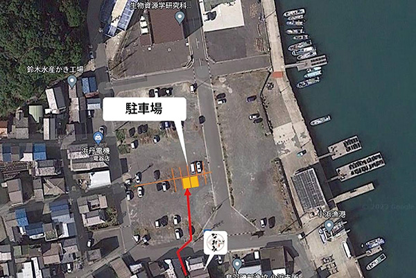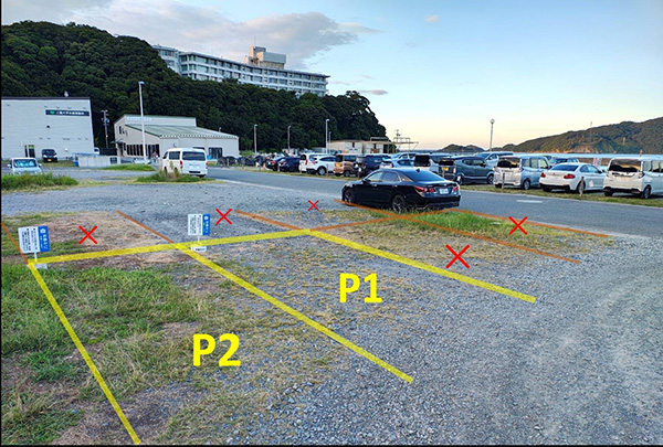 旅館すぐ近くに大きな砂利の広場があります。そこの2台分をお借りしております。 写真の場所に駐車をお願いします。